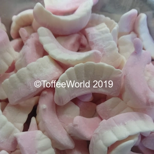 Strawberry and vanilla flavoured soft jelly sweets in the shape of Teeth - very retro - very tasty sweets - great for party bags, novelty themed events and most of all great for eating! enjoy