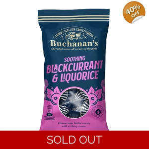 Buchanan's Blackcurrant and Liquorice hard-boiled sweets with a soft chewy centre. Each Buchanan's Blackcurrant and Liquorice sweet is a purple-coloured oval-sized sweet that is individually twist-wrapped for extra freshness.