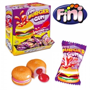 Fini Burger Gums are delicious burger-shaped bubblegums with a delicious strawberry flavour liquid centre. Bite into this tasty bubble gum and watch the 'ketchup' spill out.